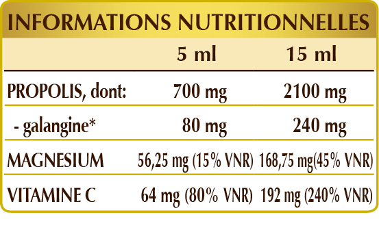 *flavonoïdes totaux exprimés en galangine. NRV= Valeur Nutritionnelle de Référence