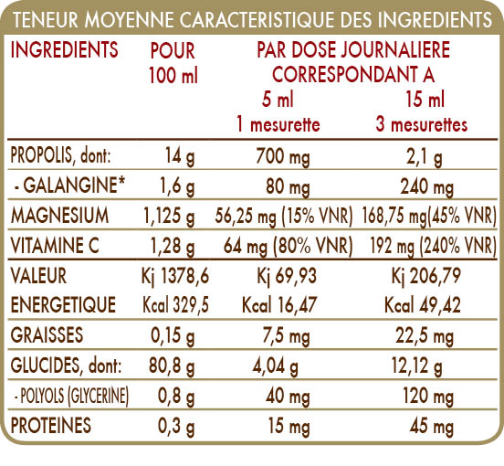 *flavonoïdes totaux exprimés en galangine. VNR = Valeur nutritionnelle de référence.