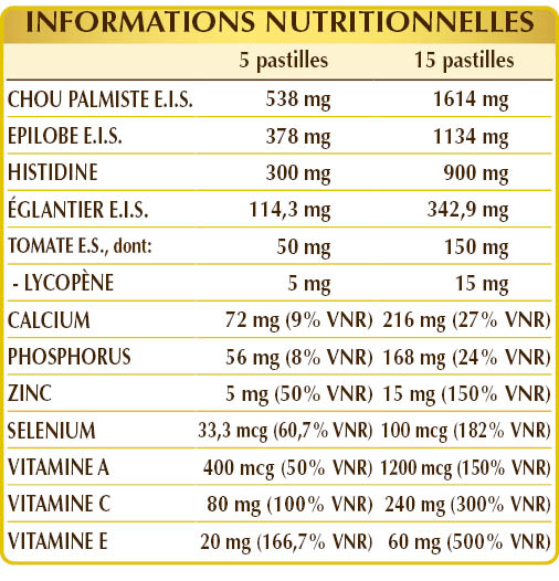 E.I.S.= Extrait Intégral Sec. L'extraction des plantes que nous effectuons dans notre entreprise se fait sous vide et à basse température pour maintenir intacts tous les principes actifs et nutritifs (phytocomplexe); en moyenne 4 kg de plantes donnent 1 kg d'extrait sec (4: 1). Les variations possibles de la couleur des pastilles entre différents lots de produits reflètent les plantes naturelles utilisées, en l’absence de principes synthétiques.Sans ingrédients d'origine animale.
