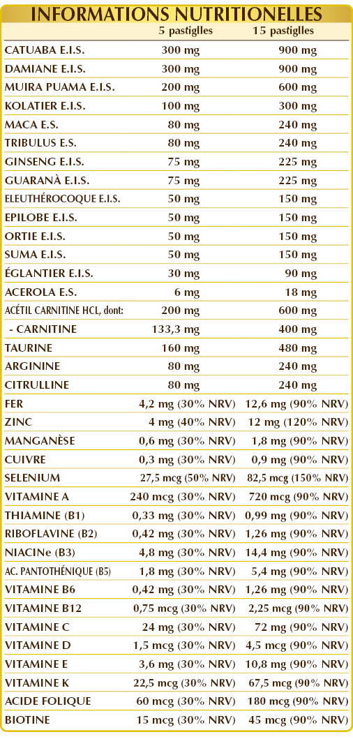 Catuaba (Erythroxylum catuaba) écorces E.I.S., damiane (Turnera diffusa) feuilles E.I.S., acétyl-(L-)carnitine HCL ou chlorhydrate, muira puama (Ptychopetalum olacoides) bois E.I.S., cellulose microcristalline°, gomme arabique°, taurine, kolatier (Cola nitida) graines E.I.S., (L-)arginine, (L-)citrulline, maca ou ginseng péruvien (Lepidium meyenii) racines E.I.S., tribulus terrestris (Tribulus terrestris) fruits E.S. (standardisé à 90% de saponine), ginseng (Panax ginseng) racines E.I.S., guarana (Paullinia cupana) grains verts (torréfiés) E.I.S., eleuthérocoque ou ginseng de Sibérie (Eleutherococcus senticosus) racines E.I.S., épilobe (Epilobium parviflorum) herbe E.I.S., ortie (Urtica dioica) racines E.I.S., suma ou ginseng brésilien (Pfaffia paniculata) racines E.I.S., dioxyde de silicium°, gluconate de zinc°°, églantier (Rosa canina) fruits E.S. (standardisé à 70% de vitamine C), citrate d'ammonium ferrique, gluconate de stéarate de magnésium d'origine végétale°°, vitamine E d'origine végétale (acétate de D-α-tocophéryle), acérola (Malpighia glabra) fruits E.S. (standardisé à 50% de vitamine C), gluconate de manganèse, vitamine B3 (nicotinamide), vitamine B5 (pantothénate de calcium), vitamine A (acétate de rétinyle), sulfate de cuivre, vitamine B2 activée (riboflavine 5-phosphate de sodium), vitamine B6 activée (pyridoxal-5-phosphate), lichen (Cladonia rangiferina) thalle E.S. (standardisé en vitamine D3 cholécalciférol 100 000 UI/g), vitamine B1 (chlorhydrate de thiamine), sélénite de sodium, acide folique activé (L-méthylfolate de calcium), vitamine K1 (phyloquinone), biotine, vitamine B12 activée (5'-désoxyadénosylcobalamine, méthylcobalamine). °Agent de charge. °°Antiagglomerante.