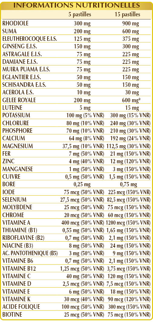 Rhodiole (Rhodiola rosea) racines Pulv, glycérophosphate de magnésium, phosphate de calcium dibasique, gelée royale lyophilisée, suma ou ginseng brésilien (Pfaffia paniculata) racines Pulv, cellulose microcristalline°, gomme arabique°, chlorure de potassium, éleuthérocoque ou ginseng de Sibérie (Eleutherococcus senticosus) racines E.I.S., ginseng (Panax ginseng) racines E.I.S.,astragale (Astragalus membranaceus) racines E.I.S., damiane (Turnera diffusa) feuilles E.I.S., muira puama (Ptychopetalum olacoides) bois E.I.S., églantier (Rosa canina) fruits E.S. (standardisé à 70 % de vitamine C), schisandra (Schisandra chinensis) fruits E.I.S., rose d’Inde (Tagetes erecta) capitules (fleurs) E.S. (standardisé à 10 % en lutéine), citrate d'ammonium ferrique, carbonate de calcium, stéarate de magnésium d’origine végétale°°, citrate de potassium, gluconate de zinc, oxyde de magnésium, vitamine E d'origine végétale (acétate de D-α-tocophérol), dioxyde de silicium°°, acérola (Malpighia glabra) fruits E.S. (standardisé à 50% de vitamine C), gluconate de manganèse, vitamine B3 (nicotinamide), borate de sodium, vitamine B5 (pantothénate de calcium), vitamine A (acétate de rétinyle), sulfate de cuivre, vitamine B2 activée (riboflavine 5-phosphate de sodium), vitamine B6 activée (pyridoxal-5-phosphate), lichen (Cladonia rangiferina) thalle E.S. (standardisé à vitamine D3 cholécalciférol 100 000 UI/g), vitamine B1 (chlorhydrate de thiamine), chlorure de chrome, acide folique activé (L-méthylfolate de calcium), iodure de potassium, molybdate de sodium, sélénite de sodium, vitamine K1 (phylloquinone), biotine, vitamine B12 activée (5-désoxyadénosylcobalamine, méthylcobalamine).