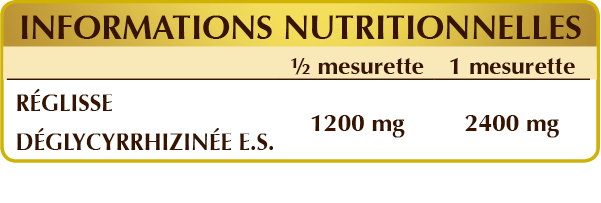Extrait sec de déglycyrrhizinate de racines de réglisse (Glycyrrhiza glabra) (titré à 3% d’acide glycyrrhizique ou glycyrrhizine), maltodextrines de maïs ou de riz ; édulcorants d'origine naturelle : glycosides de stéviol de stévia, thaumatine.