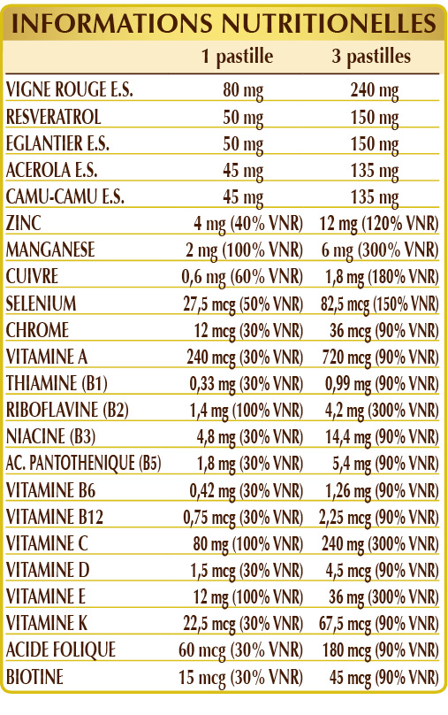 Vigne rouge (Vitis vinifera) graines E.S. (titré à 95% de proanthocyanidine oligomérique), resvératrol d’origine végétale, églantier (Rosa canina) fruits E.I.S. (titré à 70% en vitamine C), cellulose microcristalline°, gomme arabique°, acérola (Malpighia glabra) fruits E.S. (titré à 50 % de vitamine C), camu-camu (Myrciaria dubia) fruits E.S. (titré à 50% en vitamine C), gluconate de zinc, vitamine E d’origine naturelle (acétate de D-α-tocophéryle), gluconate de manganèse, dioxyde de silicium°°, vitamine B3 (niacine), stéarate de magnésium d’origine végétale°°, sulfate de cuivre, vitamine B2 activée (riboflavine 5-phosphate de sodium), vitamine B5 (pantothénate de calcium), vitamine A (acétate de rétinyle), vitamine B6 activée (pyridoxal-5-phosphate), lichen (Cladonia rangiferina) thalle E.S. (titré en vitamine D3 cholécalciférol 100 000 UI/g), vitamine B1 (chlorhydrate de thiamine), chromium picolinate, sélénite de sodium, acide folique activé (L-méthylfolate de calcium), vitamine K1 (phyloquinone), biotine, vitamine B12 activée (5'-désoxyadénosylcobalamine, méthylcobalamine). °Agent de charge °° Agent antiagglomérant