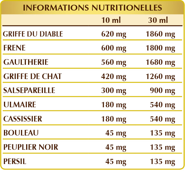 La griffe du diable, le frêne, la gaulthérie, la griffe de chat, la salsepareille, le cassissier et le peuplier noir favorisent le bon fonctionnement des articulations. En outre, le frêne, l'ulmaire, le cassissier, le bouleau blanc et le persil améliorent le drainage des fluides corporels et le bon fonctionnement des voies urinaires.