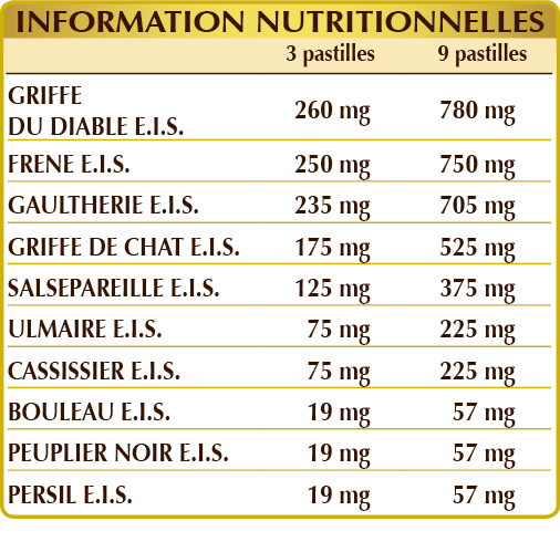 Griffe du diable (Harpagophytum procumbens) racines E.I.S., frêne commun (Fraxinus excelsior) feuilles E.I.S., gaulthérie (Gaultheria procumbens) feuilles E.I.S., griffe de chat (Uncaria tomentosa) écorces E.I.S., cellulose microcristalline°, gomme arabique°, salsepareille (Smilax medica) racines E.I.S., ulmaire ou reine-des-prés (Filipendula ulmaria) herbe E.I.S., cassissier (Ribes nigrum) feuilles E.I.S., dioxyde de silicium°°, bouleau blanc (Betula alba ou pubescens) feuilles E.I.S., peuplier noir (Populus nigra) bourgeons E.I.S., persil (Petroselinum crispum) racines E.I.S., stéarate de magnésium d’irigine végétale°°. °Agent de charge.