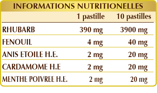 Rhubarbe chinoise (Rheum palmatum) rhizomes, cellulose microcristalline°, gomme arabique°, dioxyde de silicium°°, fenouil (Foeniculum vulgare) fruits H.E., anis étoilé (Illicium verum) fruits H.E., cardamome (Elettaria cardamomum) graines H.E., menthe poivrée (Mentha piperita) feuilles H.E., stéarate de magnésium d'origine végétale°°.
