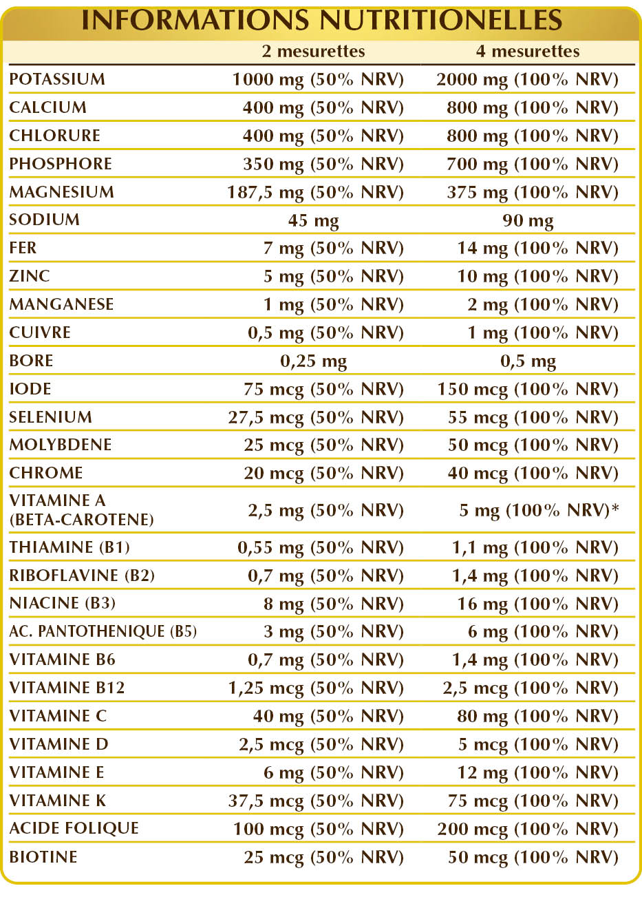 Maltodextrine de maïs ou de riz, glycérophosphate de calcium, citrate de potassium, citrate de magnésium, citronnier (Citrus limonum) fruits J.D., chlorure de potassium, glycérophosphates de magnésium, régulateur d'acidité : acide citrique, citrate de sodium, phosphate de potassium dibasique, citrate d'ammonium ferrique, gluconate de zinc, vitamine C (acide ascorbique), dunaliella (Dunaliella salina) thalle (algue) E.S. (standardisé à 10 % en bêta-carotène), vitamine E (acétate de DL-α-tocophéryle) ; édulcorants d’origine naturelle : glycosides de stéviol issus de la stévia, thaumatine ; gluconate de manganèse, vitamine B3 (nicotinamide), gluconate de cuivre, vitamine B5 (pantothénate de calcium), borate de sodium, vitamine B2 activée (riboflavine 5-phosphate de sodium), vitamine D3 (cholécalciférol 100 000 UI/g), vitamine B6 activée (pyridoxal-5-phosphate), vitamine B1 (chlorhydrate de thiamine), acide folique activé (L-méthylfolate de calcium), chlorure de chrome, iodure de potassium, molybdate de sodium, sélénite de sodium, vitamine K1 (phylloquinone), biotine, vitamine B12 activée (5-désoxyadénosylcobalamine, méthylcobalamine).