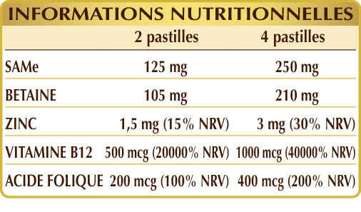 Complément alimentaire à base de SAMe (S-adénosylméthionine), enrichi en bétaïne et autres nutriments. En particulier, le SAMe est une molécule naturellement présente dans le corps humain et principalement produite par le foie. La vitamine B12 favorise le fonctionnement du système nerveux et, avec l’acide folique, contribue au métabolisme normal de l’homocystéine ainsi qu’à la fonction psychologique normale.
