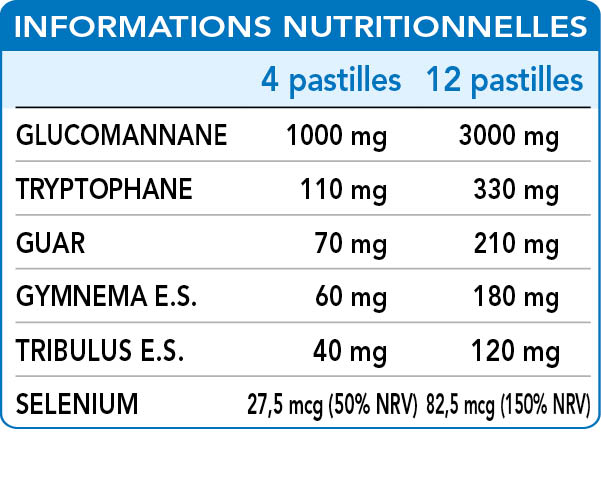 Poudre de racines de glucomannane (Amorphophallus konjac) (90% de fibres alimentaires), cellulose microcristalline°, gomme arabique°, (L-)tryptophane, poudre de graines de guar (Cyamopsis tetragonoloba), feuilles de gymnema (Gymnema sylvestre) E.S. (titré à 75% de acide gymnémique), tribulus (Tribulus terrestris) fruits E.S. (titré à 90% de saponine, maltodextrine de maïs ou de riz, dioxyde de silicium°, gélatine alimentaire°°, stéarate de magnésium d’origine végétale°°, sélénite de sodium.