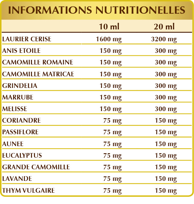 Glycérine végétale distillée, eau pure, cerise laurier (Prunus laurocerasus) feuilles fraîches E.I.L., anis étoilé (Illicium verum) fruits E.I.L., camomille vulgaire (Matricaria chamomilla) têtes de fleurs E.I.L., camomille romaine (Anthemis nobilis) têtes de fleurs E.I.L., grindélia (Grindelia robusta) herbe avec des fleurs E.I.L., marrube (Marrubium vulgare) herbe avec des fleurs E.I.L., mélisse (Melissa officinalis) feuilles E.I.L., passiflore (Passiflora incarnata) herbe avec des fleurs E.I.L., coriandre (Coriandrum sativum) fruits E.I.L., aunée (Inula helenium) racines E.I.L., eucalyptus (Eucalyptus globulus) feuilles E.I.L., grande camomille ou chrysanthème matricaire (Tenacetum parthenium) herbe avec des fleurs E.I.L., lavande (Lavandula officinalis) fleurs E.I.L., thym vulgaire (Thymus vulgaris) feuilles E.I.L. ; édulcorants naturels: glycosides de stéviol (E960), extraits de feuilles de stevia, et thaumatine (E957), extraits de fruits de katemfe.