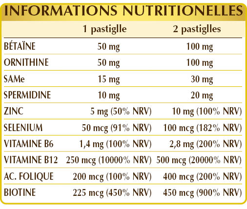 Glycéro-phosphate de magnésium, cellulose microcristalline°, bétaïne, (L-)ornithine HCL ou chlorhydrate, gomme arabique°, gluconate de zinc, SAMe (S-adénosyl méthionine disulfate tosylate), dioxyde de silicium°°, trichlorhydrate de spermidine, stéarate de magnésium d’origine végétale°°, vitamine B6 activée (pyridoxal-5-phosphate), biotine, acide folique activé (L-méthylfolate de calcium), vitamine B12 activée (5-désoxyadénosylcobalamine, méthylcobalamine), sélénite de sodium.