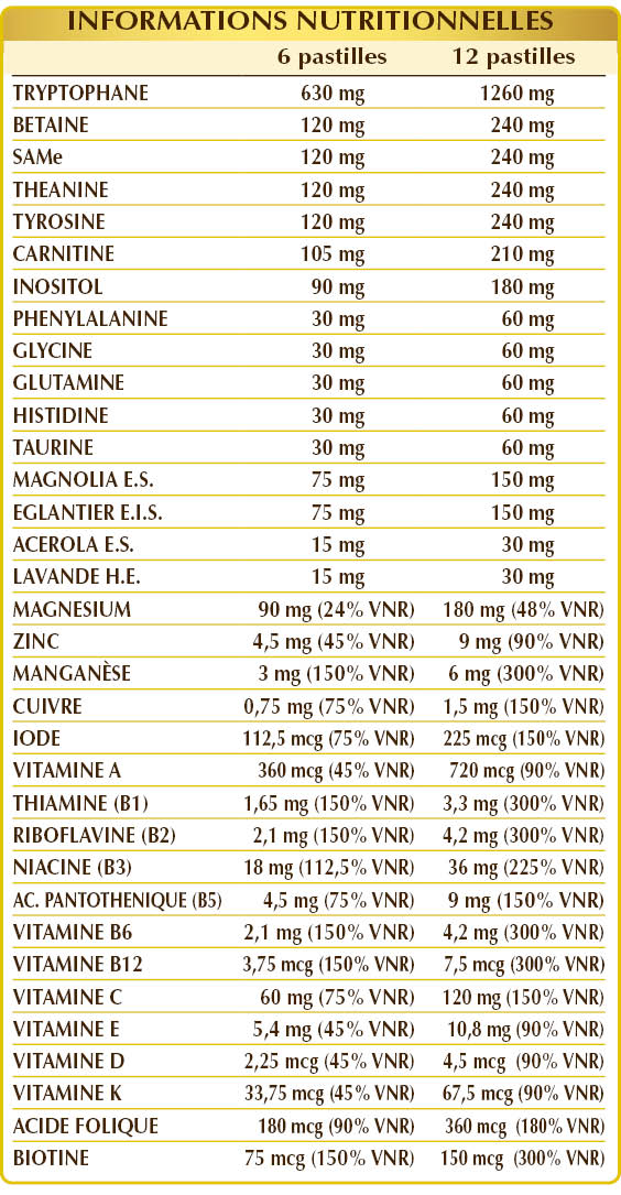 (L-)tryptophane, cellulose microcristalline°, gomme arabique°, SAMe (S-adénosylméthionine disulfate tosylate), acétyl (L-)carnitine HCl ou chlorhydrate, oxyde de magnésium, bétaïne, (L-)théanine, (L-)tyrosine, myo-inositol d'origine végétale (extrait de graines de maïs), magnolia (Magnolia officinalis) écorces E.S. (titré à 90% de magnolol et honokiol), églantier (Rosa canina) fruits E.I.S. (titré à 70% de vitamine C), dioxyde de silicium°°, gluconate de zinc, (L-) phénylalanine, glycine, (L-) glutamine, (L-) histidine, taurine, gluconate de manganèse, gélatine alimentaire, vitamine B3 (nicotinamide), acérola (Malpighia glabra) fruits E.S. (titré à 50% de vitamine C), lavande (Lavandula officinalis) sommités fleuries H.E., stéarate de magnésium d'origine végétale°°, vitamine E d'origine naturelle (acétate de D-α-tocophéryle), gluconate de cuivre, vitamine B5 (pantothénate de calcium), vitamine B2 activée (riboflavine 5-phosphate de sodium), vitamine B6 activée (pyridoxal-5-phosphate), vitamine A (acétate de rétinyle), vitamine B1 (chlorhydrate de thiamine), lichen (Cladonia rangiferina) thalle E.S.. (titré en vitamine D3 cholécalciférol 100 000 UI/g), acide folique activé (L-méthylfolate de calcium), iodure de potassium, biotine, vitamine K1 (phylloquinone), vitamine B12 activée (5-désoxyadénosylcobalamine, méthicobalamine). °Agent de charge. °°Agent anti-agglomérant.