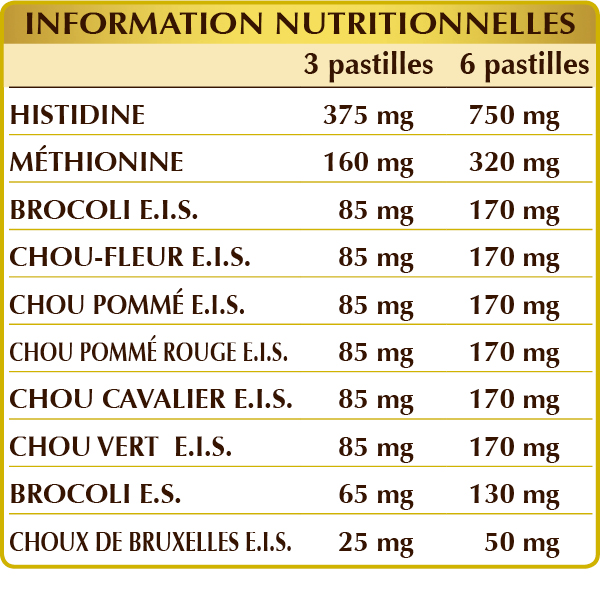 (L-)histidine, cellulose microcristalline°, (L-)méthionine, gomme arabique°, brocoli (Brassica oleracea var. italica) herbe avec des fleurs E.S. (titré à 17% de sulforaphanine), dioxyde de silicium°°, brocoli (Brassica oleracea var. italica) herbe avec des fleurs E.I.S., chou-fleur (Brassica oleracea var. botrytis) herbe avec des fleurs E.I.S., chou blanc (Brassica oleracea var. capitata f. alba) feuilles E.I.S., chou rouge (Brassica oleracea var. capitata f. rubra) feuilles E.I.S., chou noir (Brassica oleracea var. acephala) feuilles E.I.S., chou de Savoie (Brassica oleracea var. sabauda) feuilles E.I.S., stéarate de magnésium d'origine végétale°°, choux de Bruxelles (Brassica oleracea var. gemmifera) feuilles E.I.S.