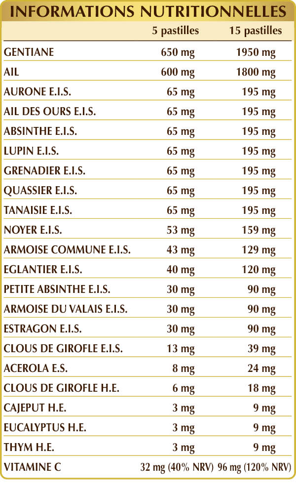 Gentiane (Gentiana lutea) racines Plv, ail (Allium sativum) bulbes séchés à basse température Pulv., cellulose microcristalline°, gomme arabique°, aurone (Artemisia abrotanum) sommités E.I.S., ail des aurs (Allium ursinum) feuilles E.I.S., absinthe majeure ou romaine (Artemisia absinthium) herbe avec des fleurs E.I.S., lupin (Lupinus albus) graines E.I.S., grenadier commun (Punica granatum) écorces des fruits E.I.S., quassier (Quassia amara) bois E.I.S., tanaise (Tanacetum vulgare) herbe avec des fleurs E.I.S., noyer (Juglans regia) fruits frais immatures (verts) et feuilles E.I.S., armoise commune (Artemisia vulgaris) herbe avec des fleurs E.I.S., dioxyde de Silicium°°, églantier (Rosa canina) fruits E.I.S. (titré à 70% de vitamina C), petite absinthe (Artemisia pontica) herbe avec des fleurs E.I.S., armoise du valais (Artemisia vallesiaca) herbe avec des fleurs E.I.S., estragon (Artemisia dracunculus) feuilles E.I.S., clous de girofle (Eugenia caryophyllata) bourgeons floraux E.I.S., stéarate de magnésium d’origine végétale°°, acérola (Malpighia glabra) fruits E.S. (titré à 50% en vitamine C), clous de girofle (Eugenia caryophyllata) bourgeons floraux H.E., cajeput (Melaleuca leucadendron var. cajaputi) feuilles H.E., eucaliptus (Eucalyptus globulus) feuilles et rameaux H.E., thym vulgaire (Thymus vulgaris) feuilles H.E. Pulv. = Poudre