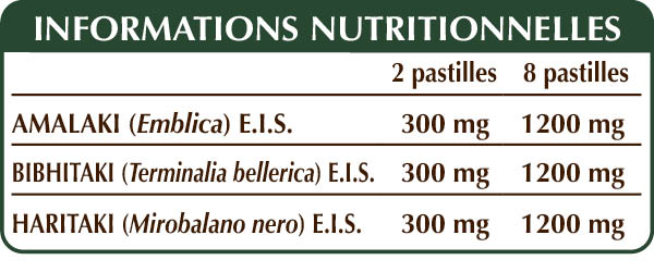 Emblique ou amalaki (Phyllantus emblica ou emblica officinalis) fruits E.I.S., terminalia bellerica ou bibhitaki (Terminalia bellerica) fruits E.I.S., myrobolan noir ou haritaki (Terminalia chebula) fruits E.I.S., cellulose microcristalline°, gomme arabique °, dioxyde de silicone °°, stéarate de magnésium d'origine végétale°°.