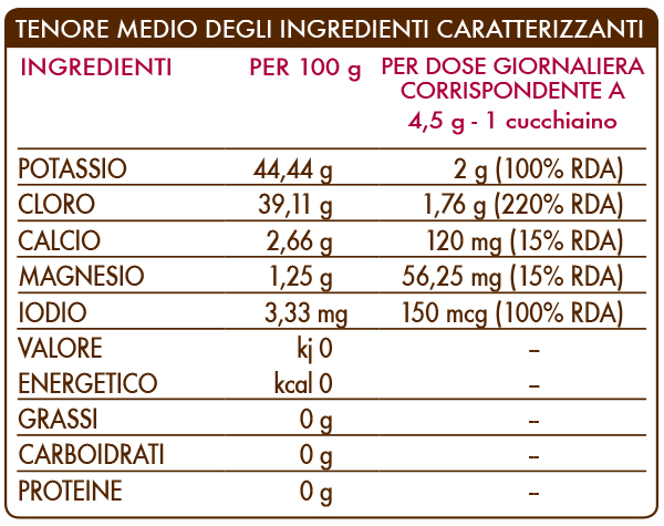Complément alimentaire riche en sels. Le potassium contribue au maintien d'une pression sanguine normale, il favorise la fonction musculaire et, ensemble à l'iode et au magnésium, il favorise le fonctionnement normal du système nerveux.