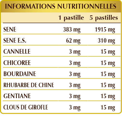Séné (Cassia angustifolia) feuilles Pulv, séné (Cassia angustifolia) feuilles E.S., gomme arabique°, cellulose microcristalline°, dioxyde de silicium°°, cannelle (Cinnamomum zeylanicum) écorces Pulv, chicorée (Cichorium intybus) racines Pulv, bourdaine (Rhamnus frangula) écorces Pulv, rhubarbe de Chine (Rheum palmatum) rhizomes Pulv, gentiane jaune (Gentiana lutea) racines Pulv, clous de girofle (Eugenia caryophyllata) bourgeons floraux Pulv, stéarate de magnésium d'origine végétale°°. Pulv. = Poudre
