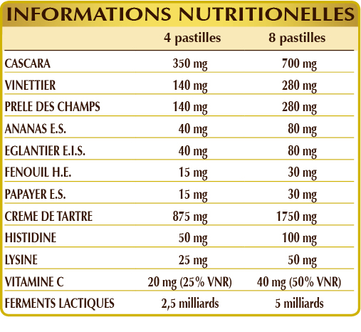 Crème de tartre de vin purifié, cascara (Rhamnus purshiana) écorces Pulv, vinettier (Berberis vulgaris) écorces des racines Pulv, prêle des champs ou queue de cheval (Equisetum arvense) herbe, cellulose microcristalline°, gomme arabique°, (L-)histidine, ananas (Ananas sativus) tiges des fruits E.S. (broméline 2500 GDU/g), églantier (Rosa canina) fruits E.S. (titré à 50% de vitamine C), (L-)lysine HCL ou chlorhydrate, ferments lactiques vivants (Bacillus coagulans ou Lactobacillus sporanges MTCC 25157), dioxyde de silicium°°, papayer (Carica papaya) fruits E.S. (papaïne 30.000 U/mg), fenouil (Foeniculum vulgare) fruits H.E., stéarate de magnésium d'origine végétale.°°