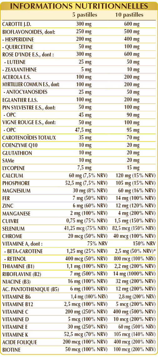Carotte (Daucus carota) racines J.D., tagète (Tagetes erecta) têtes des fleurs E.S. (standardisé à 10% de lutéine), phosphate dicalcique, cellulose microcristalline°, gomme arabique°, hespéridine d'agrumes, maltodextrine de maïs ou de riz, fruits d'acérola (Malpighia glabra) E.S. (normalisé à 50% de vitamine C), myrtille commune (Vaccinium myrtillus) fruits E.S. (standardisé à 25% d’ anthocyanosides), églantier (Rosa canina) fruits E.I.S. (standardisé à 70% de vitamine C), vitamine C (acide ascorbique), tomate (Solanum lycopersicum) fruit E.S. (standardisé à 10% de lycopène), vitamine E d’origine végétale (acétate D-α-tocoferile), gluconate de fer, glycérophosphate de magnésium, quercétine, pin sylvestre (Pinus sylvestris) écorces E.S. (standardisé à 90% en proanthocyanidine oligomérique ou OPC), rose d'Inde (Tagetes erecta) capitules (fleurs) E.S. (standardisé à 10% de zéaxanthine), vigne rouge (Vitis vinifera) graines E.S. (standardisé à 95% en proanthocyanidine oligomérique ou OPC), gluconate de zinc, oxyde de magnésium, dioxyde de silicium°°, SAMe (S-adenosyl methionine disulfate tosylate), gluconate de manganèse, vitamine B3 (nicotinamide), dunaliella (Dunaliella salina) thalle (algues) E.S. (standardisé à 10% de bêta-carotène), stéarate de magnésium d'origine végétale°°, coenzyme Q10, glutathion réduit, carbonate de calcium, vitamine B2 (riboflavine), vitamine B5 (pantothénate de calcium), sulfate de cuivre, vitamine A (acétate de rétinyle), vitamine B6 activée (pyridoxal-5-phosphate), lichen (Cladonia rangiferina) thalle E.S. (standardisé en vitamine D3 cholécalciférol 100 000 UI/g), vitamine B1 (chlorhydrate de thiamine), acide folique activé (L-méthylfolate de calcium), picolinate de chrome, sélénite de sodium, vitamine K1 (phyloquinone), biotine, vitamine B12 activée (5'-désoxyadénosylcobalamine, méthylcobalamine). °Agent de charge. °°Antiagglomerante.