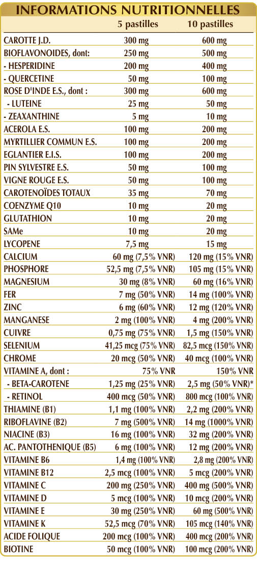 Carotte (Daucus carota) racines J.D., tagète (Tagetes erecta) têtes des fleurs E.S. (standardisé à 10% de lutéine), phosphate dicalcique, cellulose microcristalline°, gomme arabique°, hespéridine d'agrumes, maltodextrine de maïs ou de riz, fruits d'acérola (Malpighia glabra) E.S. (normalisé à 50% de vitamine C), myrtille commune (Vaccinium myrtillus) fruits E.S. (standardisé à 25% d’ anthocyanosides), églantier (Rosa canina) fruits E.I.S. (standardisé à 70% de vitamine C), vitamine C (acide ascorbique), tomate (Solanum lycopersicum) fruit E.S. (standardisé à 10% de lycopène), vitamine E d’origine végétale (acétate D-α-tocoferile), gluconate de fer, glycérophosphate de magnésium, quercétine, pin sylvestre (Pinus sylvestris) écorces E.S. (standardisé à 90% en vitamine C), rose d'Inde (Tagetes erecta) capitules (fleurs) E.S. (standardisé à 10% de lutéine), vigne rouge (Vitis vinifera) graines E.S. (standardisé à 95% en proanthocyanidine oligomérique), gluconate de zinc, oxyde de magnésium, dioxyde de silicium°°, SAMe (S-adenosyl methionine disulfate tosylate), gluconate de manganèse, vitamine B3 (nicotinamide), dunaliella (Dunaliella salina) thalle (algues) E.S. (standardisé à 10% de bêta-carotène), stéarate de magnésium d'origine végétale°°, coenzyme Q10, glutathion réduit, carbonate de calcium, vitamine B2 (riboflavine), vitamine B5 (pantothénate de calcium), sulfate de cuivre, vitamine A (acétate de rétinyle), vitamine B6 activée (pyridoxal-5-phosphate), lichen (Cladonia rangiferina) thalle E.S. (standardisé en vitamine D3 cholécalciférol 100 000 UI/g), vitamine B1 (chlorhydrate de thiamine), acide folique activé (L-méthylfolate de calcium), picolinate de chrome, sélénite de sodium, vitamine K1 (phyloquinone), biotine, vitamine B12 activée (5'-désoxyadénosylcobalamine, méthylcobalamine). °Agent de charge. °°Antiagglomerante.