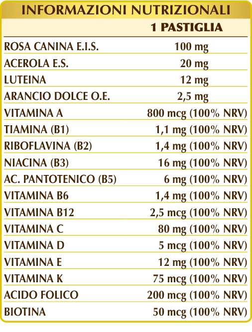 Multivitamique contenant 100% du VNR de toutes les vitamines dans une seule pastille. Chaque vitamine exerce une fonction spécifique et, en particulier elle contribue à: protéger les cellules contre le stress oxydatif (B2, C, E); maintenir la fonction normale du système immunitaire (A, B6, B12, C, D et acide folique), du système nerveux (B1, B2, B3, B6, B12, C et biotine), des os (C, D, K) et de la capacité visuelle (B2, A); combattre la fatigue physique et l'affaiblissement (B2, B3, B5, B6, B12, C et acide folique).
