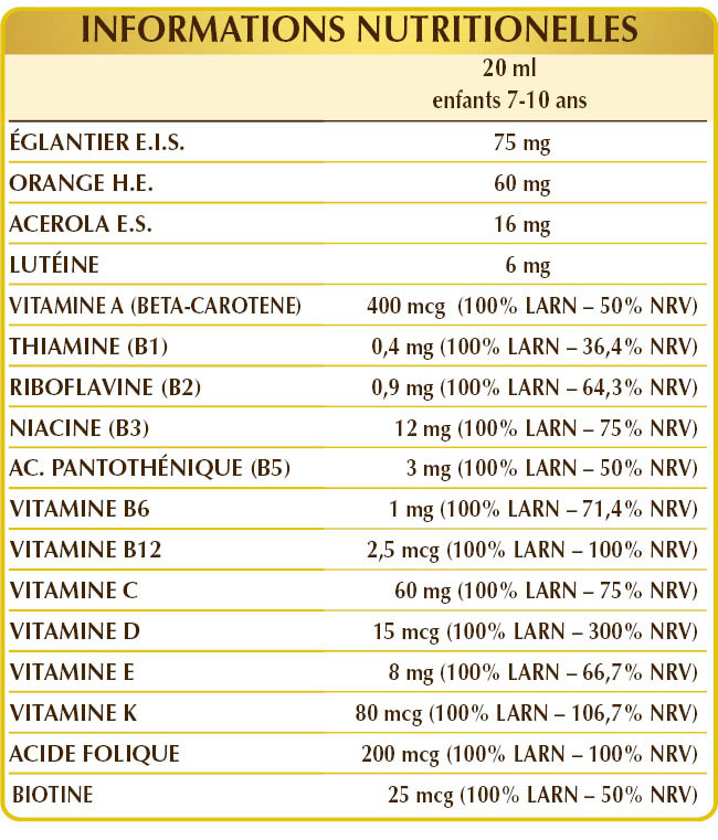 Glycérine végétale bi-distillée, eau pure, rose d'Inde (Tagetes erecta) têtes des fleurs (fleurs) E.S.. (standardisé à 5 % en lutéine), gluconate de fer, cynorrhodon (Rosa canina) fruits E.I.S. (standardisé à 70 % en vitamine C), gluconate de zinc ; arôme naturel : écorces de fruits d’orange douce (Citrus aurantium var. sinensis ou dulcis) O.E. ; gomme xanthane, bêta-carotène (standardisé à 10 %), vitamine E (acétate de DL-α-tocophérol), acerola (Malpighia glabra) fruits (standardisé à 50 % en vitamine C), vitamine B3 (nicotinamide), gluconate de manganèse, vitamine D3 (cholécalciférol 100 000 UI/g), gluconate de cuivre, vitamine B5 (pantothénate de calcium), borate de sodium, vitamine B2 activée (riboflavine 5’-phosphate de sodium), vitamine B6 activée (pyridoxal-5’-phosphate), vitamine B1 (chlorhydrate de thiamine), acide folique activé (L-méthylfolate de calcium), iodure de potassium, picolinate de chrome, sélénite de sodium, vitamine K1 (phylloquinone), molybdate de sodium, biotine, vitamine B12 activée (5-désoxyadénosylcobalamine, méthylcobalamine)