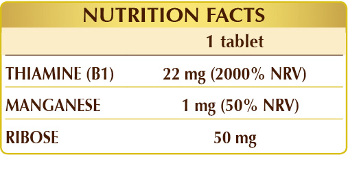 Complément alimentaire de vitamine B1 en pastilles à croquer, enrichi en manganèse et ribose. La vitamine B1 contribue à une fonction cardiaque normale, favorise le fonctionnement du système nerveux, soutient la fonction psychologique et, avec le manganèse, favorise le métabolisme énergétique.
