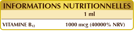 Glycérine végétale bidistillée, eau pure, vitamine B12 activée (5-désoxyadénosylcobalamine, méthylcobalamine).