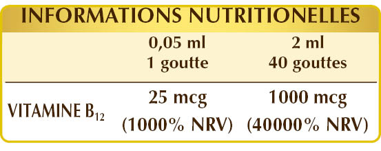 Glycérine végétale bidistillée, eau pure, fructose, vitamine B12 (cyanocobalamine), vitamine B12 activée (5-désoxyadénosylcobalamine, méthylcobalamine).