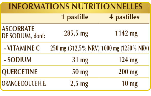 Vitamine C (ascorbate de sodium), cellulose microcristalline°, quercétine d'origine végétale, phosphate de calcium dibasique°, gomme arabique°, dioxyde de silicium°°, stéarate de magnésium d'origine végétale°°, arôme naturel : écorces de fruits d'orange douce (Citrus aurantium var. sinensis ou dulcis) H.E.