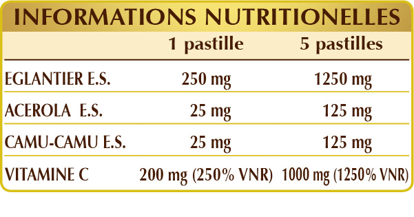 Églantier, acérola et camu-camu sont des fruits naturellement riches en vitamine C, laquelle possède des nombreuses propriétés: elle favorise le métabolisme énergétique en réduisant la fatigue et l’affaiblissement; elle protège les cellules contre le stress oxydatif et régénère la forme réduite de la vitamine E; elle contribue à la fonction normale du système immunitaire, du système nerveux et psychologique; elle favorise la formation du collagène en aidant à maintenir les fonctions normales des vaisseaux sanguins, des os, cartilages, peau, dents et des gencives; elle augmente l'absorption du fer.