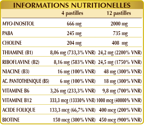 Myo-inositol d'origine naturelle (extrait de graines de maïs), tartrate de choline, PABA (acide para-aminobenzoïque), cellulose microcristalline°, gomme arabique°, phosphate dibasique de calcium°, vitamine B3 (nicotinamide, inositol hexanicotinate), vitamine B2 activée (riboflavine 5-phosphate de sodium), vitamine B1 (chlorhydrate de thiamine), dioxyde de silicium°°, vitamine B5 (pantothénate de calcium), vitamine B6 activée (phosphate de pyridoxal-5), stéarate de magnésium d'origine végétale°° ; édulcorants d'origine naturelle : glycosides de stéviol de stevia, thaumatine ; vitamine B12 activée (5-désoxyadénosylcobalamine, méthylcobalamine), biotine, acide folique activé (L-méthylfolate de calcium). °Agent de charge. °°Antiagglomerante.