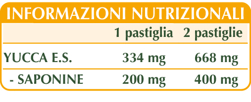 Yucca du Mojave (Yucca schidigera) hierba E.S. (standardisé à 60% en saponines), cellulose microcristalline°, gomme arabique°, dioxyde de silicium°°, stéarate de magnésium d'origine végétale°°.